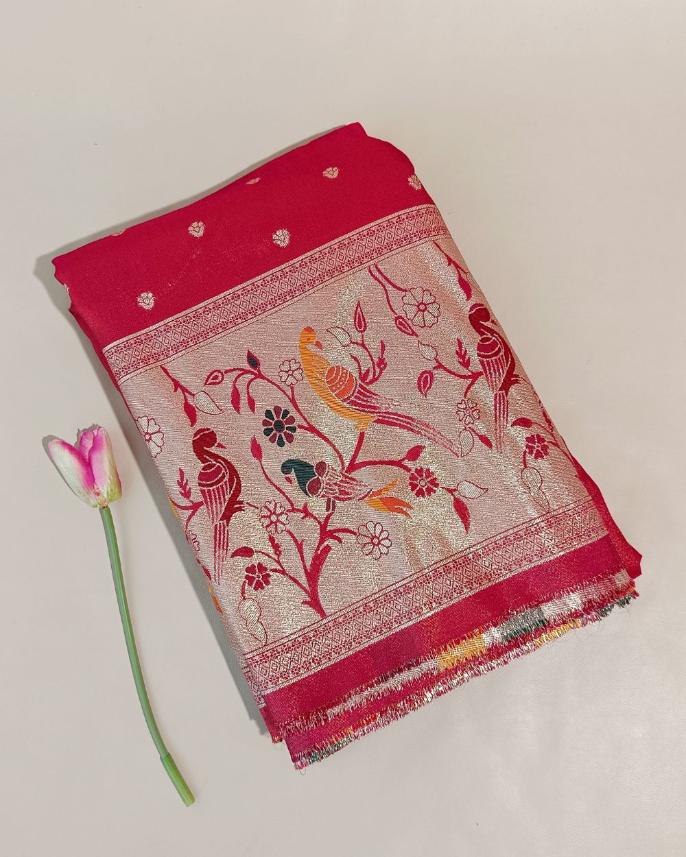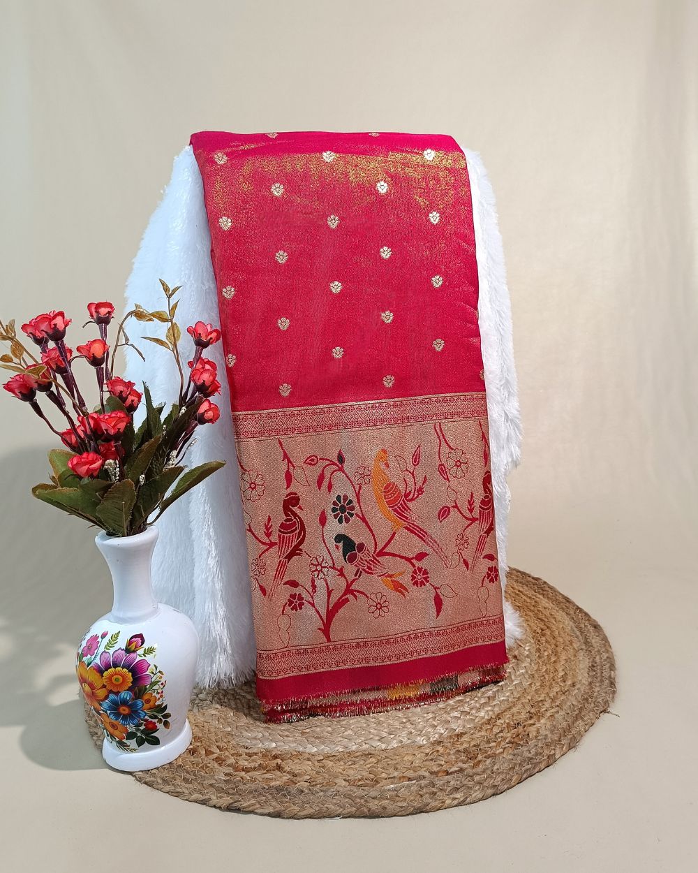 Cosmos Zari Work with Paithani Border Pinkish Red Colour 42 Inches Width