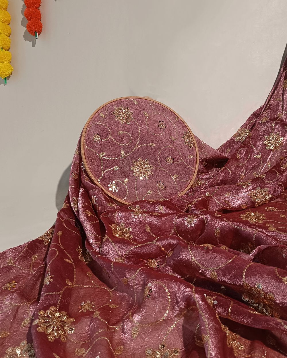 Gold crush fabric is a premium, stylish material known for its crushed texture and dazzling golden shine. The fabric is beautifully embellished with intricate metallic-tone sequin work arranged in elegant floral motifs.