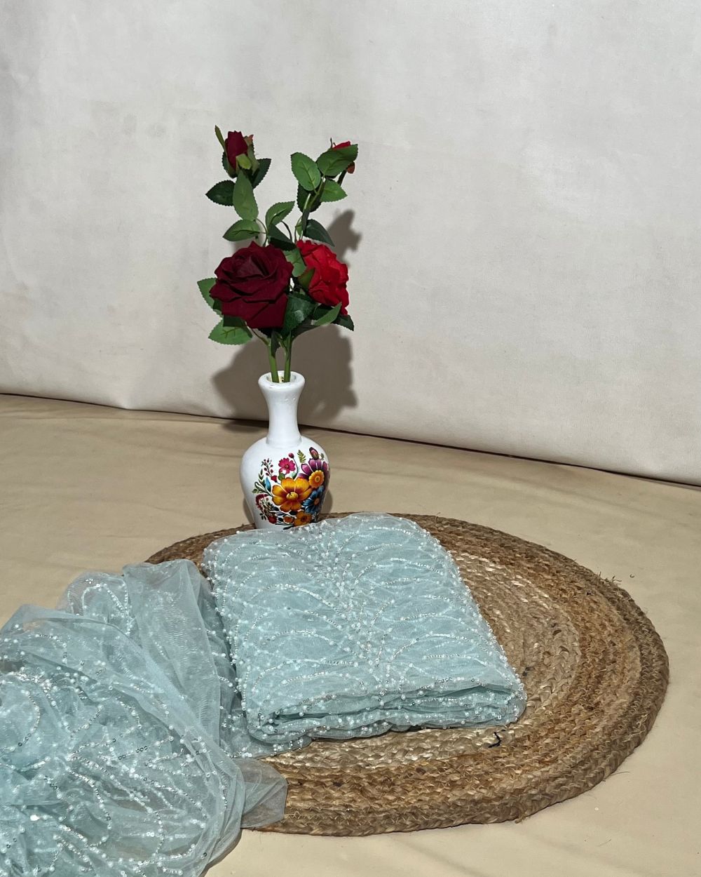 This imported net work fabric is detailed with premium sequin and moti work, creating a richly textured and elegant designer finish. The intricate embellishment is carefully crafted to form elegant, flowing patterns that enhance the fabric’s luxurious appeal while preserving its lightweight and graceful drape.