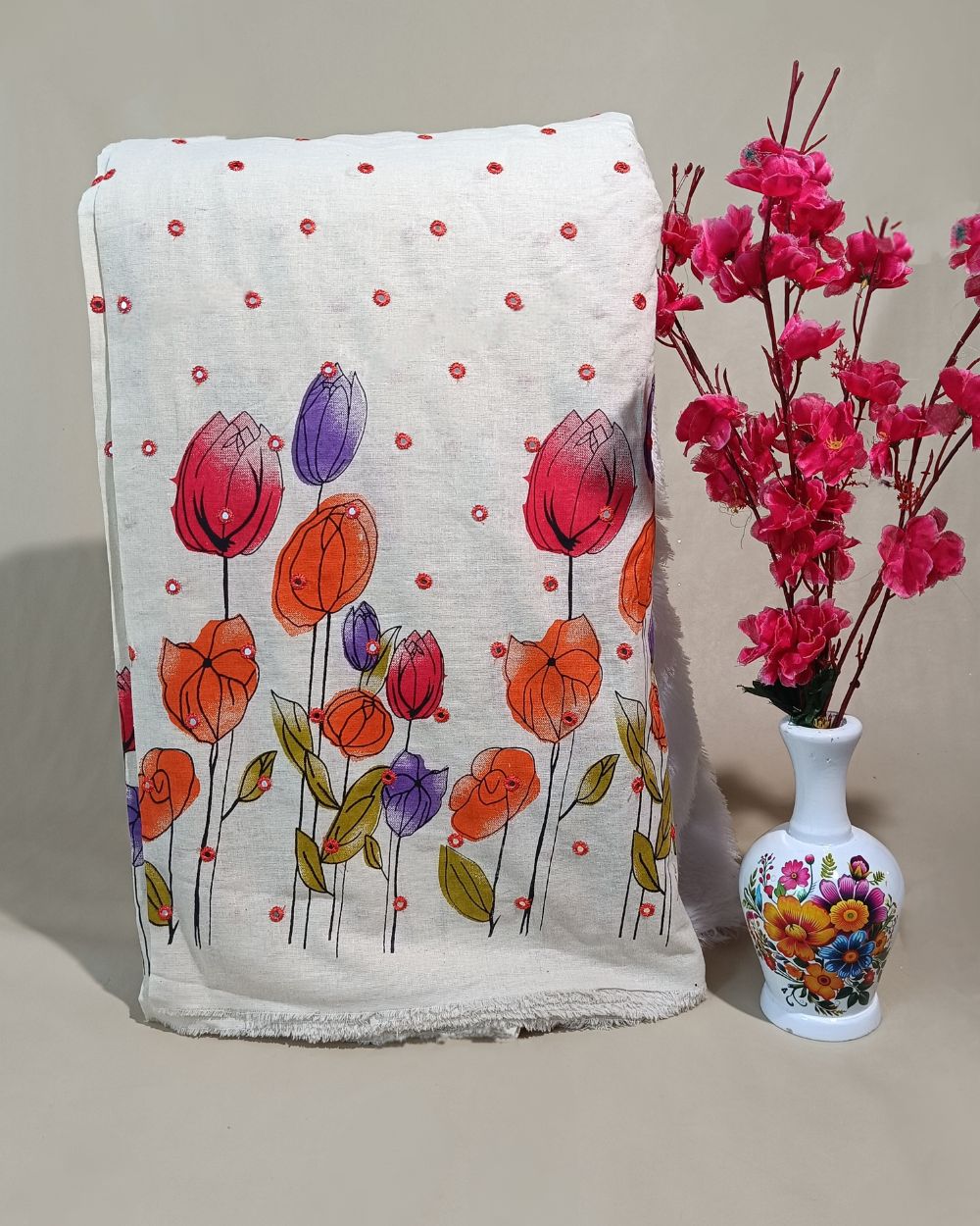 Khadi Cotton Abla Work with Border Orange Colour 42 Inches Width