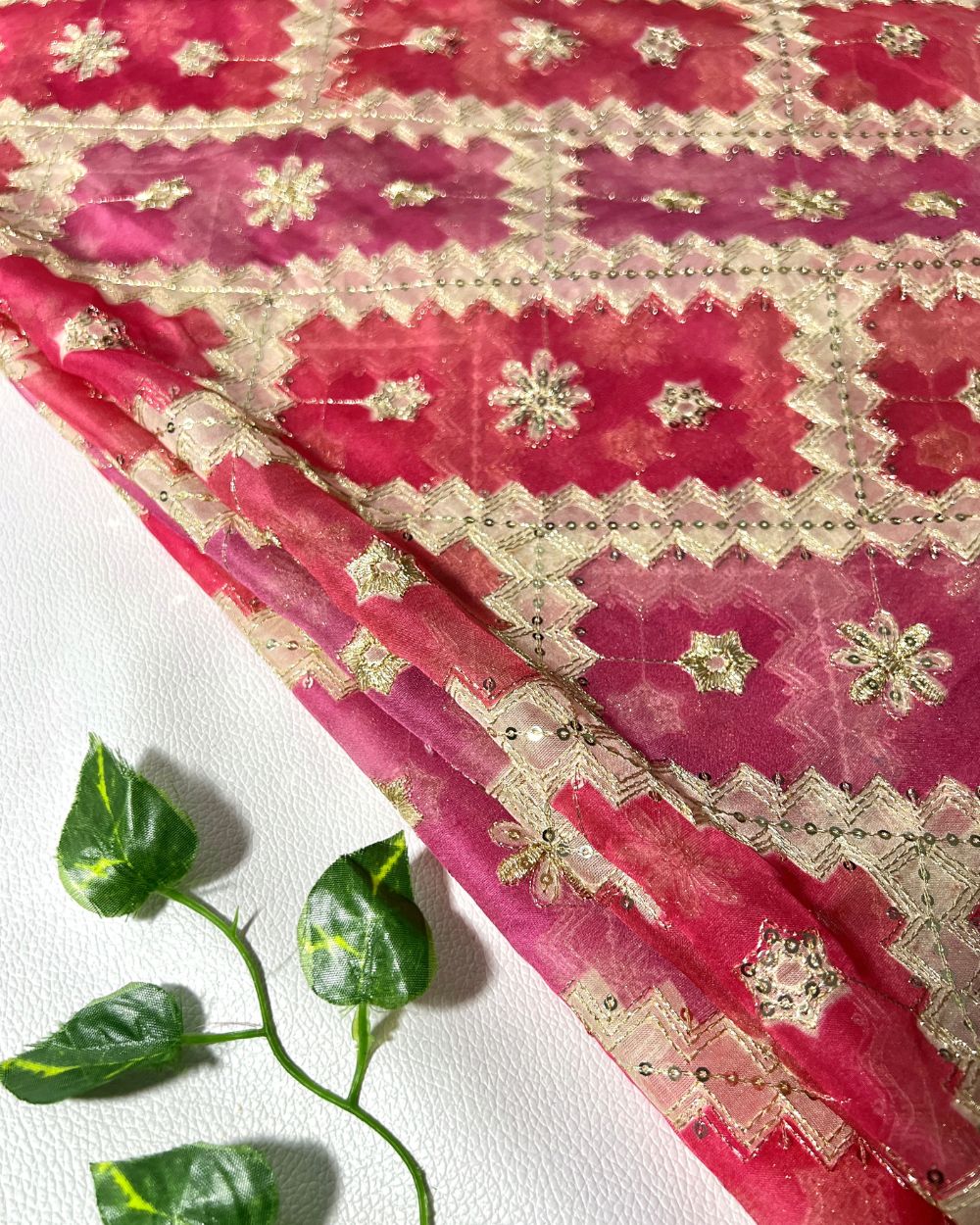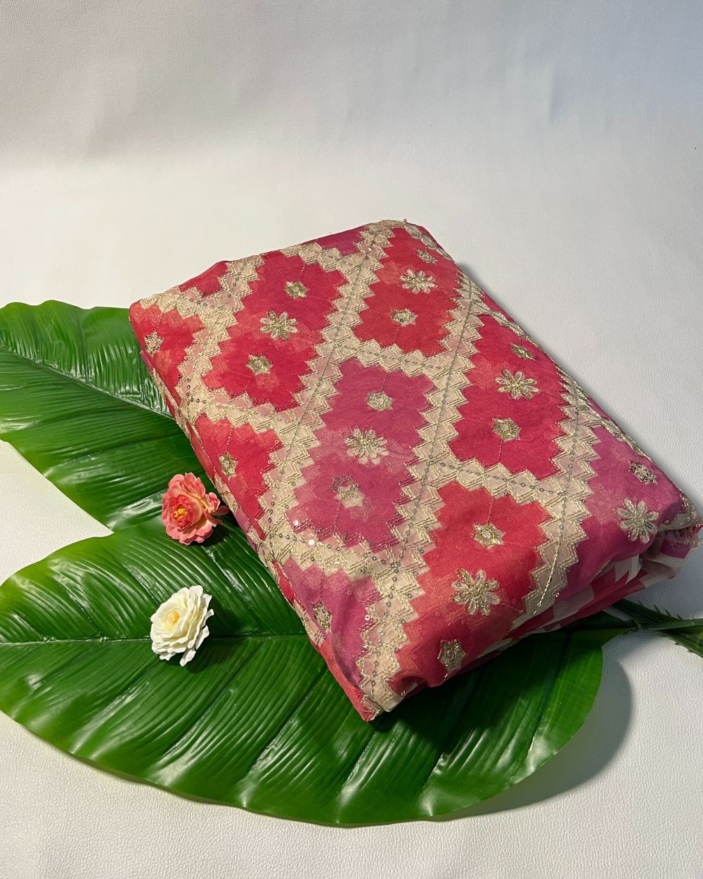 Position Print with Sequin Embroidery on Premium Organza Pink Colour 48 Inches Width